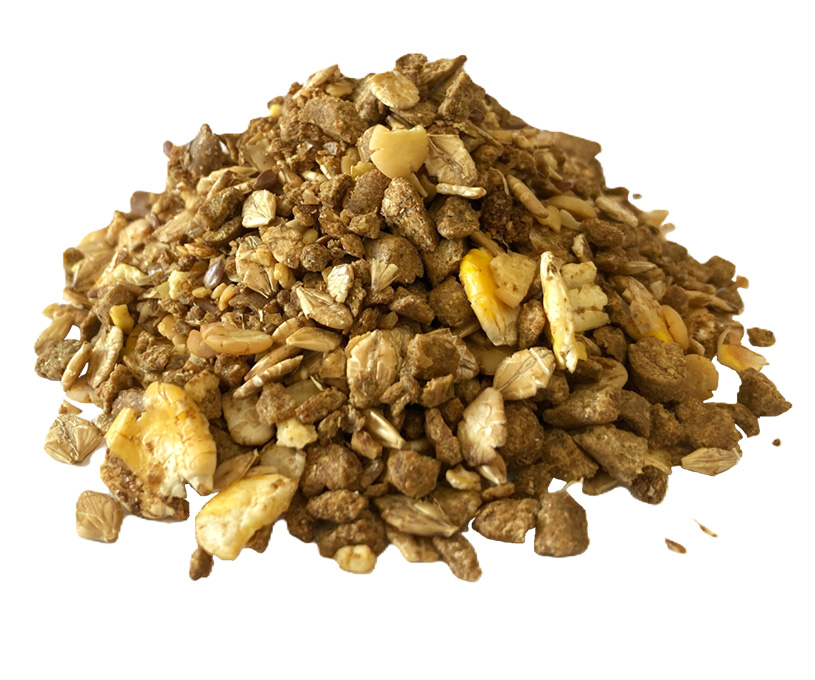 馬の食べやすさに配慮し、ペレットをさらに砕いたクランブル加工をしております。