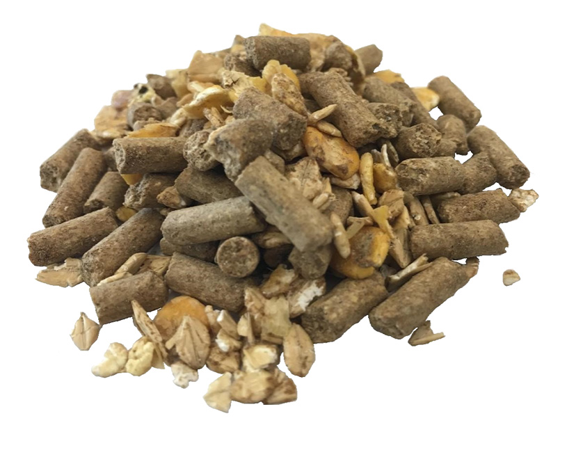 トウモロコシ圧片、大麦圧片、ペレットに糖蜜をかけて混合しています。