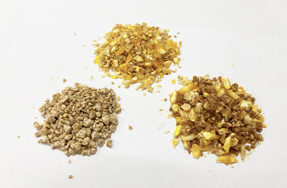 スターターはクランブル加工で消化吸収に優れ、雛が食べやすい均一な粒度を実現。初期の飼料摂取量が向上し、高増体が狙えます。フィニッシャーでは飼料中の粒と粉の偏りが少ないクランブル&マッシュ飼料を採用。単位時間あたりの飼料摂取量が増加し、高増体が期待されます。