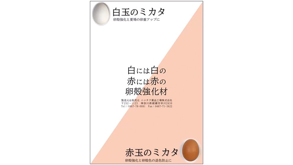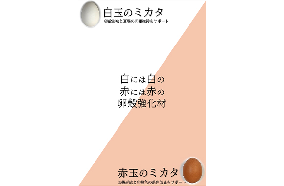 - 赤玉のミカタは卵殻強化と卵殻色維持をサポートします。