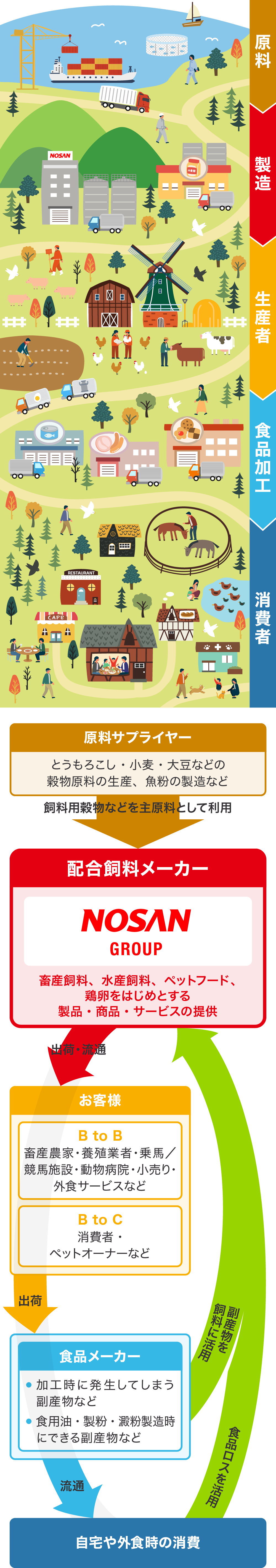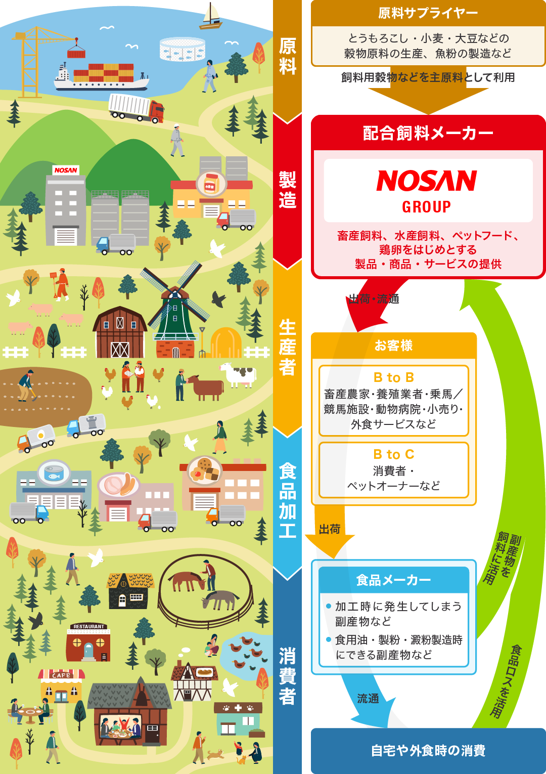 NOSANグループは、飼料や食品を扱う事業活動を通して、